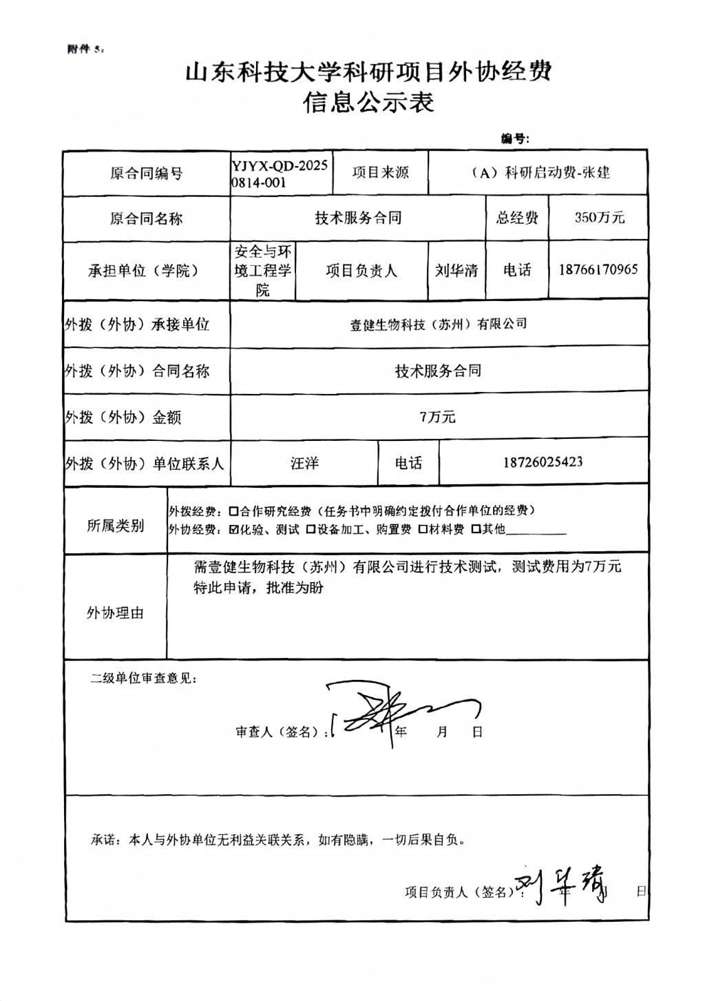 根据《山东省人民政府办公厅印发关于进一步完善财政科研项目资金管理的若干措施的通知》(鲁政办字〔2019〕120号)以及《山东科技大学科研项目与经费管理办法(试行)》(山科大发〔2020〕64号)相关规定,现对张建为项目负责人的(A)科研启动经费项目的外协经费情况进行公示,公示时间为2025年10月15日~2025年10月22日(公示时间不少于5个工作日)。若对本项外协经费有异议,请于公示期内向安全与环境工程学院或科技处反映并提交书面材料。