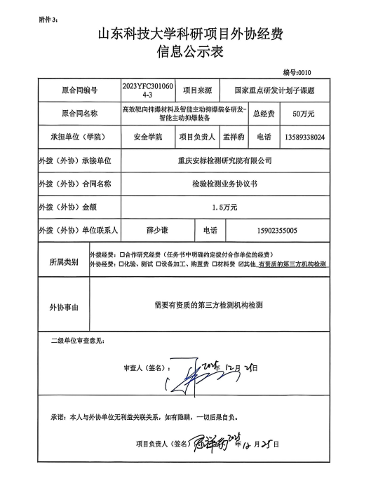 点击:根据《山东省人民政府办公厅印发关于进一步完善财政科研项目资金管理的若干措施的通知》(鲁政办字〔2019〕120号)以及《山东科技大学科研项目与经费管理办法(试行)》(山科大发〔2020〕64号)相关规定,现对 孟祥豹 为项目负责人的 高效靶向抑爆材料及智能主动抑爆装备研发-智能主动抑爆装备 项目的外协经费情况进行公示,公示时间为 2025年12月25日~2025年12月31日 。若对本项外协经费有异议,请于公示期内向安全学院或科技处反映并提交书面材料。